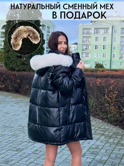 Куртка пуховик длинная с белым мехом из эко кожи