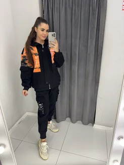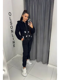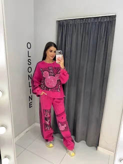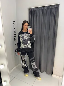 Костюм оверсайз на велюровом флисе с принтом со стразами