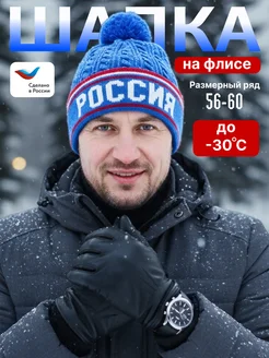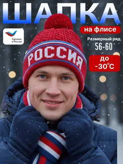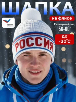 Шапка на флисе спортивная универсальная с помпоном Россия