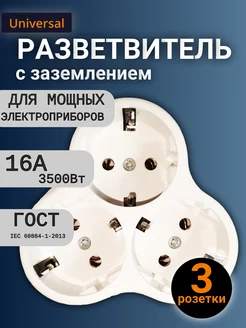 Тройник электрический 3 гнезда с заземлением 16А 3500Вт