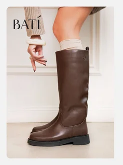 Сапоги зимние высокие кожаные без каблука трубы коричневые