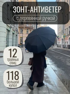 зонт автомат антиветер с деревянной ручкой