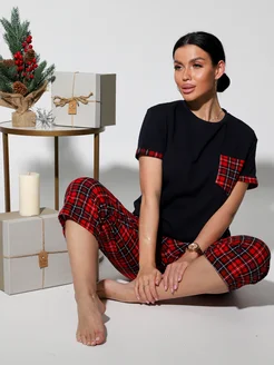 Домашний костюм с бриджами в клетку хлопок новогодний