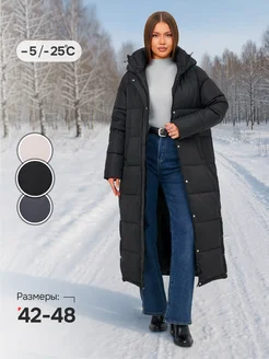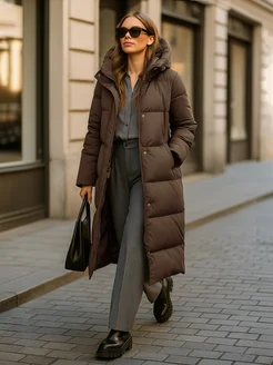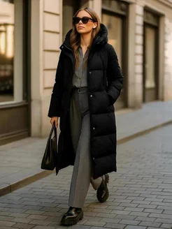 Пуховик зимний длинный с капюшоном и съемным поясом