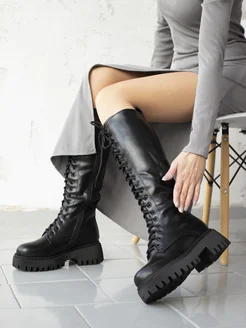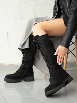 Высокие Сапоги ботфорты зимние на платформе и шнуровке