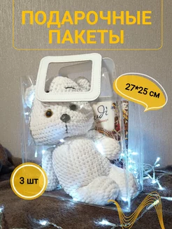 Подарочные пакеты прозрачные с белой кожаной ручкой (3 шт)