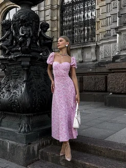 Платье летнее длинное с вырезом в цветочек крестьянка