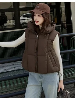 Жилетка утепленная оверсайз коричневая с капюшоном осенняя