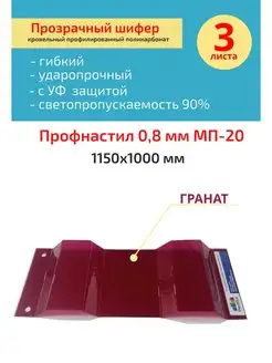 Прозрачный пластиковый шифер (Гранат) 1150х1000 мм. 3 шт
