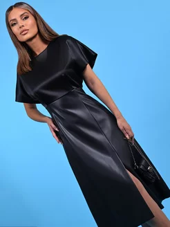 Платье атласное вечернее с экокожей приталенное