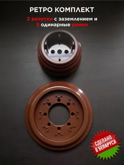 Ретро розетка с заземлением и одноместная рамка 2 комплекта