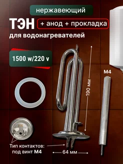 Тэн 2 квт для водонагревателя нерж под винт анод прокладка