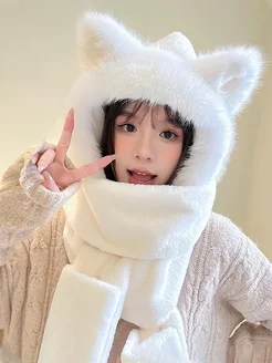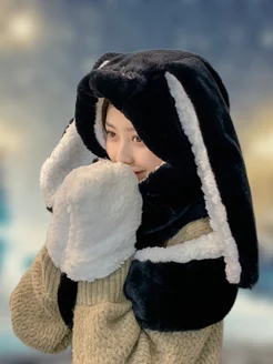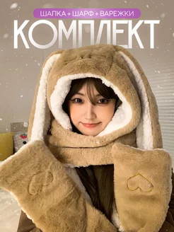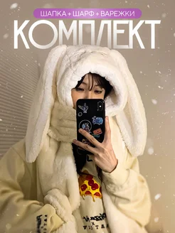 Шапка с ушками зайца женская милая шарфом и варежками