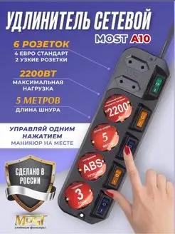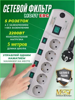 Сетевой фильтр ERG 2м, выключатели на каждую розетку