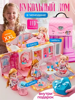 Кукольный домик с мебелью и куклами в сумочке с подсветкой
