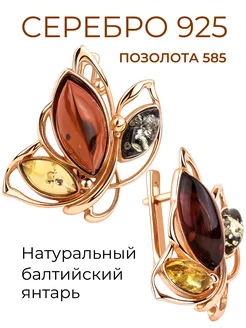 Позолоченные серьги Бабочки серебро 925 натуральный янтарь