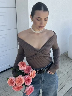 Блузка-лонгслив приталенный в рубчик с вырезом на груди
