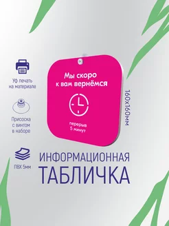 Табличка "технический перерыв 5 минут" 16х16см розовая
