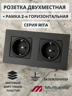 Розетка двойная черная с заземлением с гориз. рамкой