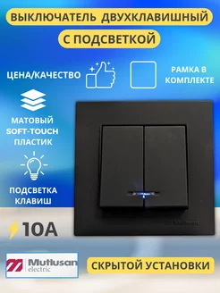Выключатель двухклавишный с подсветкой черный с рамкой 1шт