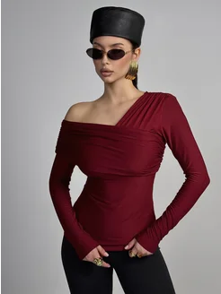 Лонгслив со спущенным плечом асимметричный с драпировкой