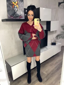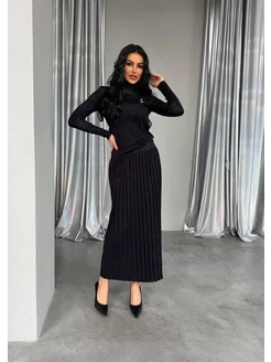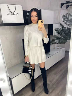 Вязаный костюм юбка плиссе и джемпер с жемчугом