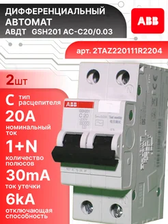 Дифавтомат 2P (2П) 20А 6кА 30мА C AC GSH201 2шт