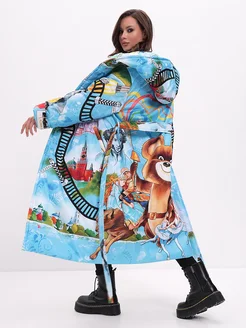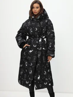 Пуховик зимний с капюшоном, длинный, теплый с принтом