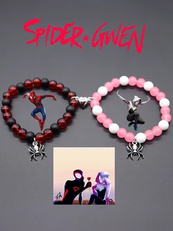 Браслеты парные из бисера Пауки, красный+розовый, на магните