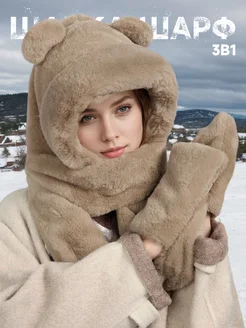 Шапка-шарф 3 в 1 с ушками мишки тедди зимняя