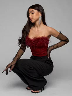 Кроп топ корсет вечерний с перьями красный