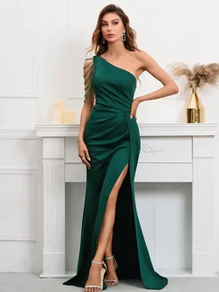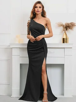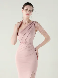 Платье вечернее с разрезом в пол на одно плечо с бусами