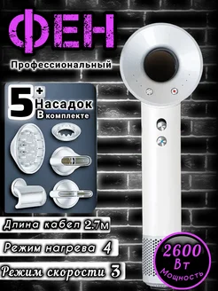 Фен для волос профессиональный мощный с насадками 5 в 1