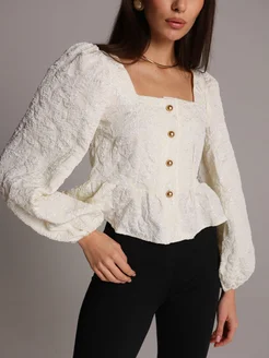 Жаккардовая блузка нарядная с баской и рукавами фонариками