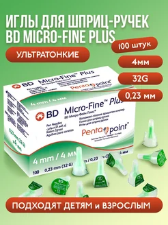 Иглы для шприц-ручек Микрофайн Плюс, 4 мм, 32G, 100 штук