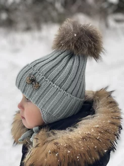 Шапка зимняя с помпоном из натурального меха и брошью