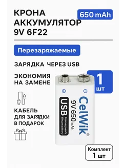 Батарейки аккумуляторные Крона 9В - 1 шт