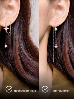 Серьги висячие,протяжки,ниточки, длинные,звезды,серебристый
