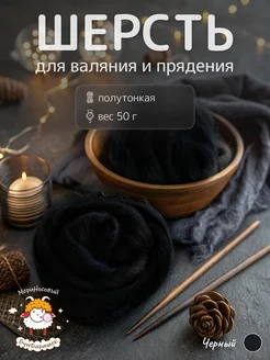 Шерсть для валяния и прядения полутонкая 50 грамм черный