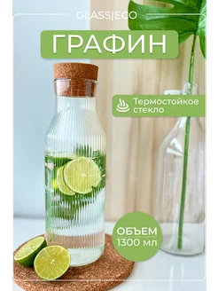 Графин для воды стеклянный с пробковой крышкой 1.3 литра