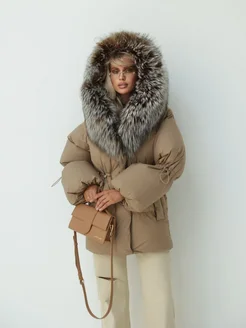 Длинный пуховик с мехом натуральной лисы и капюшоном