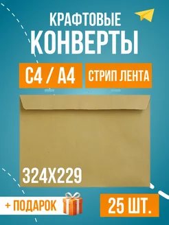 Крафтовые конверты А4, С4 стрип, прямой клапан, 25 шт