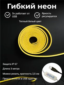 Гибкий неон c USB 3 метра теплый белый 5х12мм