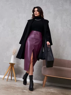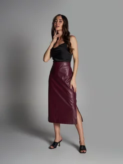 кожаная юбка миди c разрезом