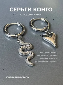 Серьги конго с подвесками сердце и змея