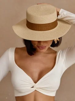 Панама летняя соломенная плетеная трендовая с узкими полями