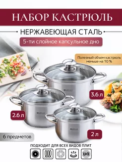 Набор кастрюль из нержавеющей стали с крышками, 3 шт