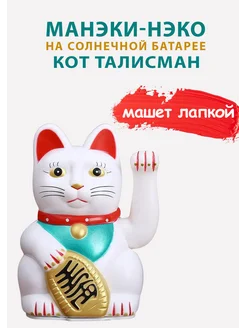 Денежный кот на солнечной батарее машет лапкой белый