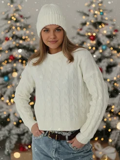 Свитер оверсайз вязаный теплый укороченный с узором косичка