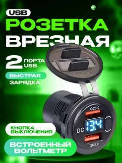 Розетка для авто врезная 2 USB Вольтметр быстрая зарядка